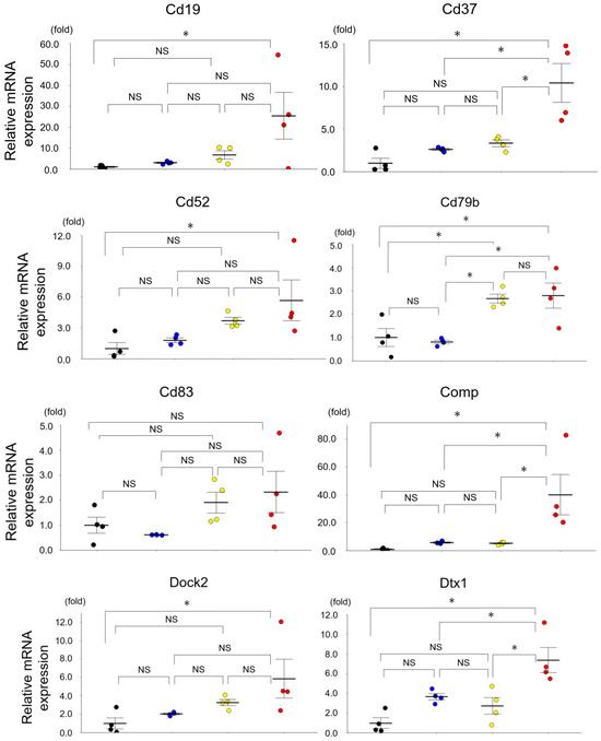 We confirmed the expression levels of 21 miRNAs in the four mouse groups using qRT-PCR: Acox2, Card11, Cd19, Cd2, Cd37, Cd52, Cd79b, Cd83, Comp, Deck2, Dtx1, IL1b, Ltb, MMP3, Npy6r, Nr4a1, Runx3, Samsn1, and Zap70. As illustrated in Figure 3, the results of this analysis demonstrated significantly upregulated expression levels of five mRNAs (Cd37, Comp, Dtx1, IL-1b, and Nr4a1) in the SAMP1-50wk mice versus the control, i.e., SAMR1-10wk, SAMR1-50wk, and SAMP1-10wk mice. No mRNAs in the SAMP1-50wk mice were downregulated compared to the control groups (Figure 3).