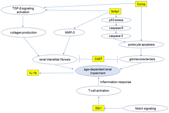 Age-dependent renal impairment develops via various pathways through five mRNAs. Cd: cluster of difference; Comp: cartilage oligomeric matrix protein; Dtx1: deltex 1; IL-1b: interleukin-1b; MMP3: matrix metalloprotease3; Nr4a1: nuclear receptor subfamily 4, group A; TGF: tumor growth factor.