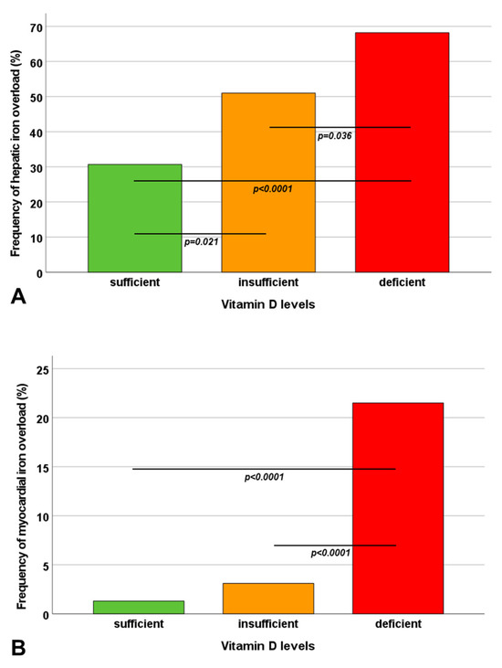 Frequency of hepatic iron overload (A) and myocardial iron overload (B) in the three groups identified based on vitamin D levels. The horizontal lines indicate a significant difference between two groups.