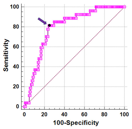 ROC curve analysis of vitamin D levels to predict myocardial iron overload. The arrow indicates the optimal cut-off value.