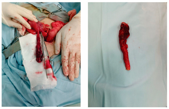 Intraoperative findings of the appendix. This figure depicts the intraoperative appearance of an appendix, characterized by marked inflammation and hyperemia. The appendix, measuring over 10 cm in length, shows significant edema with visibly engorged vessels on its serosal surface. Notably, despite the extensive inflammation, there is no evidence of rupture.