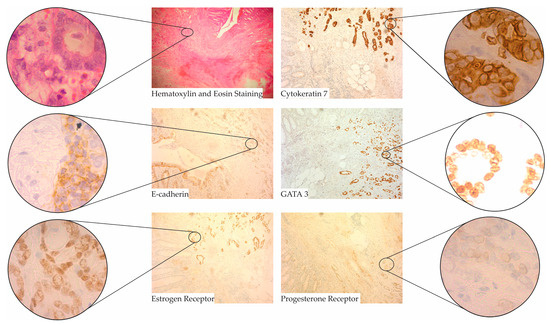 The metastatic patterns of breast carcinoma are influenced by two key factors: estrogen receptor (ER) status and the cancer’s histopathology, whether ductal or lobular [19]. ER-positive cancers tend to have a higher propensity to metastasize to the bone, whereas ER-negative tumors are more likely to result in visceral metastases [20]. Lobular carcinoma, in particular, shows a predilection for metastasizing to the gastrointestinal (GI) and gynecologic systems as well as to the peritoneum and retroperitoneum [21]. This tendency can be partly attributed to the frequent occurrence of E-cadherin mutations in invasive lobular carcinoma, leading to a lack of expression of this crucial cell–cell adhesion molecule [22]. The compromised structural integrity of epithelial sheets due to the absence of E-cadherin is a critical factor in the pathogenesis of distant metastatic disease [23].
