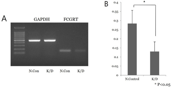 Semiquantitative PCR mRNA analysis in Ishikawa cell line. (A) A low signal of FCGRT mRNA of siRNA knock-down cell is noted. (B) Repeat test shows significant difference in mRNA expression between the control and knock-down groups (p < 0.05); N.con, scrambled RNA control; K/D, knock-down group by siRNA of FCGRT.