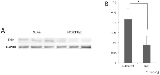 Western blot analysis. (A) Low signal of FcRn protein is noted in the knock-down group compared to the control group. (B) Repeat test shows significant difference in FcRn protein expression between the control and knock-down groups (p < 0.05); N.con, scrambled RNA control; K/D, knock-down group by siRNA of FCGRT.
