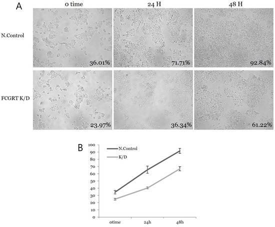 Cell proliferation analysis by confluence change. (A) Confluence change in each hotspot over time in both groups. (B) The slope of the plot shows no significant difference between the control and knock-down group; N.con, scrambled RNA control; K/D, knock-down group by siRNA of FCGRT.