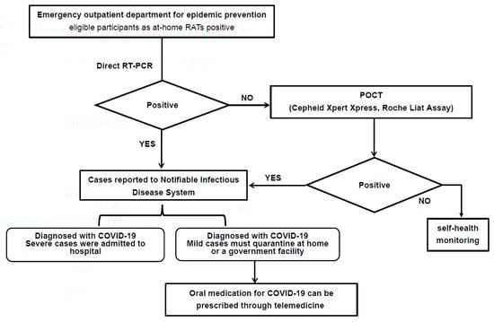 Since 2020, rapid antigen tests (RATs) have been implemented in many countries as diagnostic tools to rapidly screen for SARS-CoV-2 infections on-site during the COVID-19 pandemic. Compared to lab-based nucleic acid amplification tests (NAATs), RATs offer results in 15–30 min without specialized equipment, enabling frequent decentralized testing to quickly identify and isolate infected individuals. Numerous lateral flow and immunochromatographic RATs for detecting the SARS-CoV-2 nucleocapsid protein received emergency use authorization, facilitating widespread community and self-testing [22,23,24]. At-home rapid COVID-19 antigen tests (at-home tests) are a convenient and accessible alternative to determine infection status [24,25]. However, there are some concerns about false-positive results in asymptomatic individuals, which have influenced the clinical use of these rapid tests [26,27]. Given this, the Taiwan Central Epidemic Command Center (CECC) recommend that people who test positive for SARS-CoV-2 infection using an at-home rapid antigen test must undergo a NAAT for confirmation. The at-home kits are provided by basic-level clinics or local public health centers for those suspected to have COVID-19 infection. With the emergence of the SARS-CoV-2 Omicron variants and the increased use of COVID-19 at-home tests, laboratory-based standard processes to confirm the results of these at-home tests are mandatory to inform the decisions of health officials and hospital staff on the treatment or quarantine of individuals.