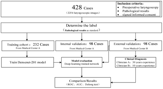 Trained on extensive sets of images representing the diseases, a DCNN model learns through specific optimization algorithms. During testing and external validation phases, it autonomously predicts a given test or validation images [32,33]. Benefiting from DCNN’s robust texture features and training on large datasets, the model generalizes well to unseen testing images, often achieving comparable or superior classification accuracy compared to a specialist. Notably, CNNs have demonstrated particular aptitude in computer vision, particularly in image interpretation, spanning domains like skin and retinal diseases [34,35,36]. In this study, we posit that deep learning techniques can similarly enhance the clinical diagnosis of LSCC. To this end, we have amassed a substantial repository of laryngoscopic images to construct a DCNN model and evaluate its performance. This study innovates by introducing, for the first time, the application of Densenet201 in laryngeal cancer recognition. Additionally, it incorporates laryngoscopic data from various medical centers as the external validation group. The research employs a multi-model modeling approach, facilitating comprehensive comparisons. Notably, we also compare the top-performance of our deep learning model with the diagnostic capabilities of clinical experts. Through this multifaceted analysis, the study provides robust evidence supporting the efficacy of deep learning in enhancing the diagnostic accuracy of laryngeal cancer under laryngoscopy. In this article, we introduced the detailed process of the experiment in the Section 2, which includes the methods of material collection, model establishment, and model validation. In the Section 3, we provide a detailed introduction to our experimental results. Subsequently, in the Section 4, we conducted a detailed discussion based on clinical background and experimental results. Finally, we summarized the conclusion of the article in the Section 5.