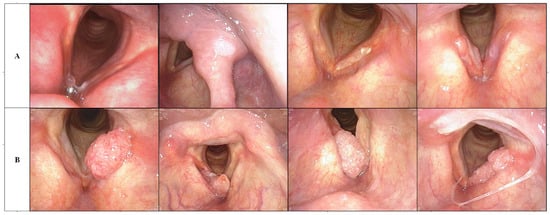 (A) Line is a benign laryngoscopy image, while line (B) is a malignant laryngoscopy image. The first image in line (A) is a polyp case, the second is a papilloma, the third is a tuberculosis, and the fourth is a granulomatous lesion.