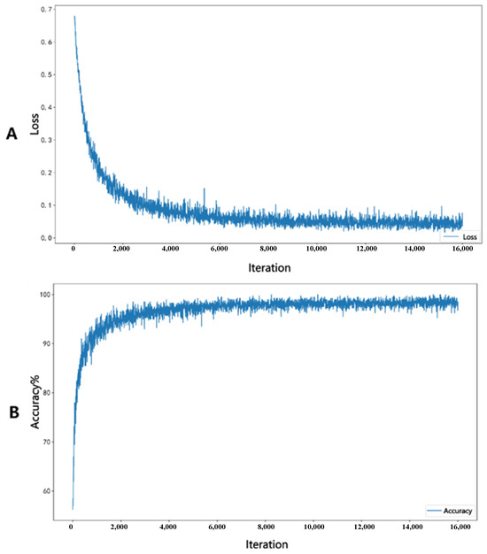 Figure (A) represents the loss decrease curve, while Figure (B) represents the accuracy change curve.