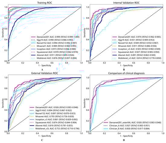 ROC of multi-model training process (A), internal validation (B), external validation (C), and comparison of ROC between external validation and clinical models in Densenet201 (D).