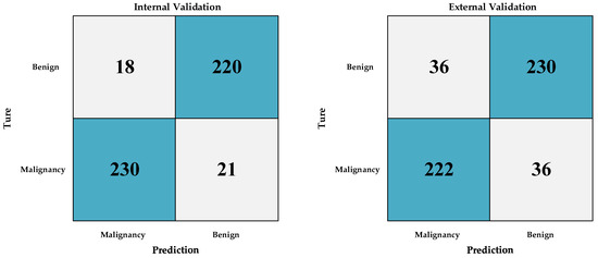 Confusion matrix between internal validation group and external validation group of Densenet201.
