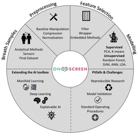 The rest of the article is structured as follows: we start with a brief introduction around CRC and then we explore its breath blueprint as it is derived from past studies. We then report the capabilities of contemporary diagnosis models for CRC and, subsequently, we dive into each step of a typical AI pipeline towards the diagnosis of CRC. We place special emphasis on identifying future challenges and considerations for the extension of the existing breathomics AI toolbox against CRC. We hope that this overview forms a basis upon which the community can further elaborate towards new advances taking into consideration the current challenges. A schematic representation of the topics discussed in this work can be seen in Figure 1.