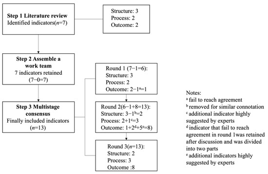 During Round 2, the expert panel engaged in face-to-face discussion conferences to evaluate the Round 1 results, exchange perspectives, and delve into detailed discussions on any concerns. This forum facilitated further refinement and development of several indicators through comprehensive discussions. Subsequently, following Round 2, a refined set of 13 indicators spanning three domains was finalized. These revised indicators formed the basis of the questionnaire that would be circulated to experts for Round 3 evaluation.