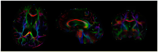The use of DTI has proven to be beneficial in the evaluation of multiple sclerosis (MS), as it has the capability to offer quantitative parameters, like FA and mean diffusivity (MD) [10]. The method has demonstrated promise in visualising and quantifying disruptions in connectivity and assessing variations in normal-appearing white matter in patients with MS [11]. It has also been shown to differentiate between various types of brain tumours, including glioblastoma and cerebral metastases, by visualising white matter tracts and providing information on tumour infiltration into surrounding brain tissue [12,13,14]. For example, DTI-derived metrics have been used to distinguish glioblastoma multiforme from normal brains, and DTI-guided radiotherapy has been suggested as an advanced approach [15,16]. Furthermore, it has also shown promise in predicting patterns of glioma recurrence, enabling improved customisation of tumour management and stratification for randomised controlled trials [17]. The method has also been widely employed to study the effects of various conditions on brain microstructural abnormalities, including traumatic brain injury [18], type 2 diabetes with mild cognitive impairment [19], and myotonic dystrophy type I [20]. Additionally, DTI has been used to study the frontal lobe white matter in children with autism spectrum disorder (ASD), revealing variances in neural pathways compared to typically developing children [21]. In a study by Sivaswamy et al., DTI was utilised to examine specific brain pathways, such as the cerebellar pathways, and has identified irregularities in children with ASD [22].