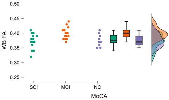 WB FA value comparisons between (from left to right) SCI, MCI, and NC with data distribution in each group.