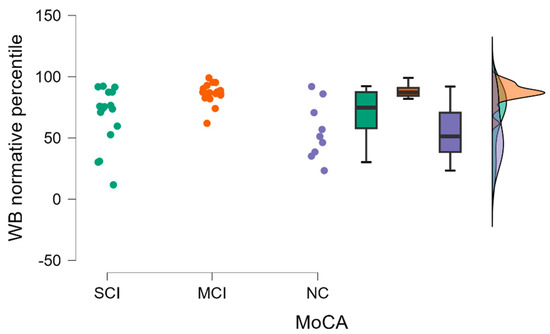 WB FA normative percentile comparisons between (from left to right) SCI, MCI, and NC with data distribution in each group.