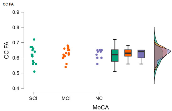 Our objective was to compare WB FA and CC FA results between the study groups that were divided based on MoCA test results. We observed statistically significant differences between the MCI-SCI and NC-MCI groups.
