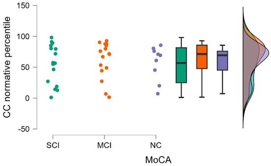 The highest mean CC FA normative percentiles were in the MCI group (the mean value in the group was 61.962), and the lowest mean percentiles were in the SCI group (the mean value in the group was 55.262).