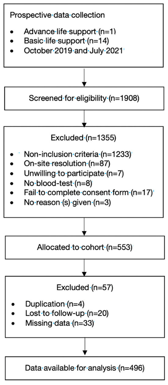 Minors, pregnant women (evident or probable), patients with unobserved cardiac arrest, traumatic ACP, refusal of hospital referral, failure to collect the three prehospital biomarkers, no informed consent (from the patient or a relative or legal guardian), and patients unable to fulfill the 365-day follow-up period were excluded.