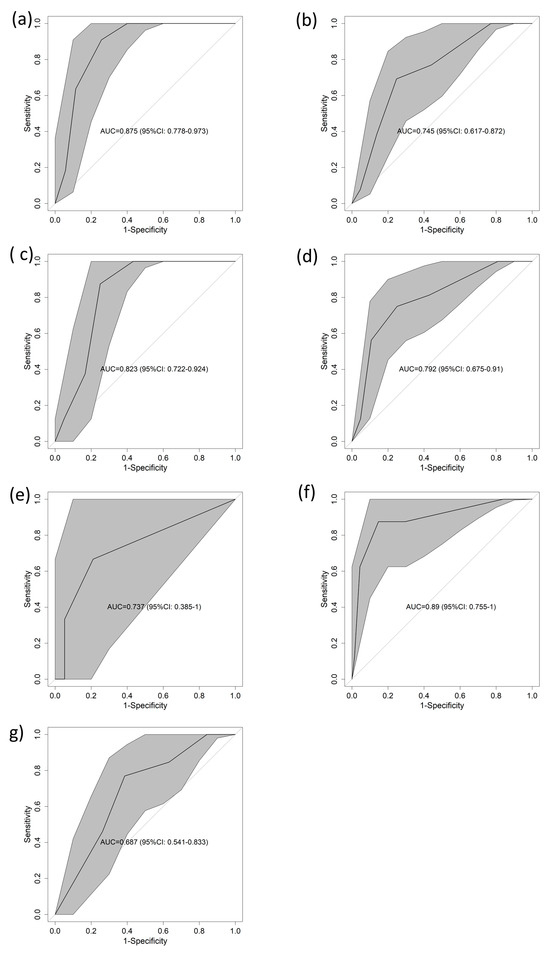 AUCs for 1-year mortality in the validation cohort according to different subsets. (a) ACP, (b) MIC, (c) female, (d) male, (e) 18 to 49 years, (f) 50 to 74 years, (g) over 74 years. Abbreviations: AUC—area under the curve of the receiver operating characteristic; CI—confidence interval.