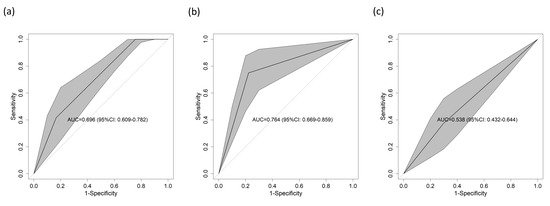 AUC for 1-year mortality in the validation cohort according to the different parameters included in the score considered individually. (a) cTnT, (b) NT-proBNP, and (c) D-dimer. All the tables had p values < 0.05, except for (c). Abbreviations: AUC—area under the curve of the receiver operating characteristic; CI—confidence interval.