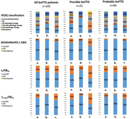 Initially, the frequencies of AD vs. non-AD CSF profiles in bvFTD (possible and probable) patients based on the four different classification criteria were calculated. The χ2 test was applied to compare frequencies of AD and non-AD patients among the different classification systems. The comparison among the classification systems included the BIOMARKAPD/ABSI criteria, the τT/Aβ42 ratio and the τP-181/Aβ42 ratio, since these criteria result in the same classification categories (i.e., AD vs. nonAD). The AT(N) was not included, because it results in multiple CSF biomarker profiles.