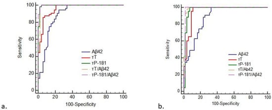 A decrease in cerebrospinal fluid (CSF) amyloid beta with 42 amino acids (Aβ42), combined with an increase in total tau protein (τT) and phosphorylated tau protein in threonine 181 (τP-181) are considered highly diagnostic of an underlying AD pathology, and have, therefore, been included in recent AD diagnostic criteria. Aβ42 is a marker of amyloid pathology, τP-181 of tau pathology and τT a nonspecific marker of neuronal injury/neurodegeneration [].