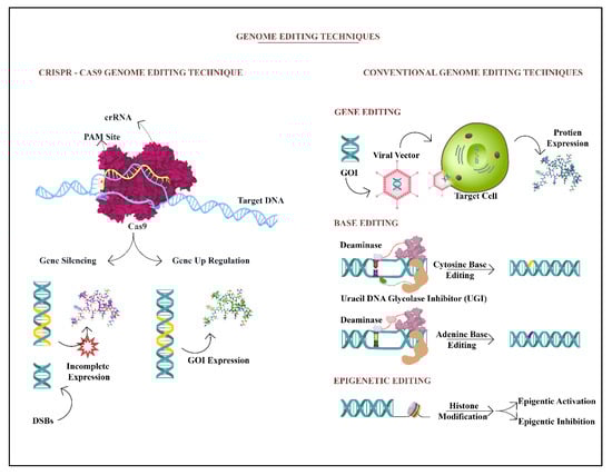 Schematic representation to exhibit the comparative method of gene editing by the most recently explored CRISPR/CAS-9 technique and the conventional tool for gene, base, and epigenetic editing.
