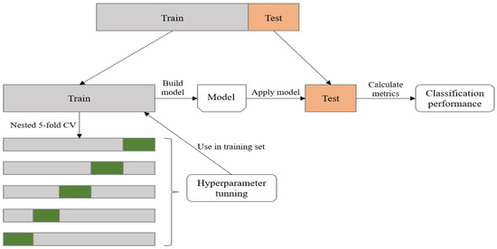 In our study, we used the k-fold cross-validation approach to account for both parameter tuning and training phase validation. As shown in Figure 2, we divided the dataset into training and testing sets following a ratio of 8:2. This study used k = 5, then the training set was split consecutively into 5 sub-folds to ensure that there were the same data splits and repetition in model comparison. Subsequently, each sub-fold can be used as the validation set to calculate the average performance and determine the optimal parameter set with the remaining (k-1) sub-folds as the training set. Within each repetition, each hyperparameter was tuned in the training set through nested 5-fold cross-validation. The test set was used to evaluate the performance of the model based on selected hyperparameters. This procedure was repeated 10 times to yield a better estimate of the test set performance.