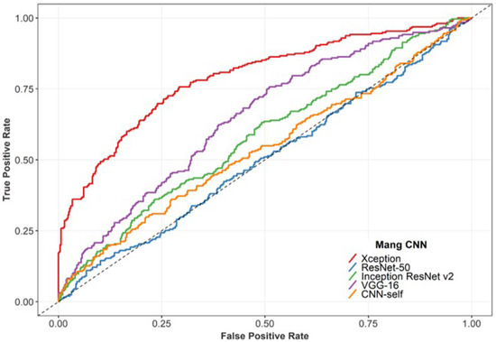 The classification performance of the five deep neural networks using mammogram data is shown in Table 2. As is seen from the table, it can be found that the Xception network outperformed considerably the rest of the classifiers with the highest accuracy of 72.5%, sensitivity of 75.7%, and specificity of 70.8%. Additionally, the sensitivity of the VGG16 network was similar to Xception, but the specificity was 48.9%, which was 21.9% less than the best specificity (70.8%). Figure 3 illustrates the ROC curves of all models. The Xception model achieved an F1S of 0.66 and an AUC of 0.79, while the AUC of the rest models was significantly lower. In clinical trials, sensitivity refers to the ability of the test to correctly detect malignant breast cancer, while specificity refers to the ability to eliminate benign lesions. Hence, we selected the Xception network to combine with clinical features in the remaining work.