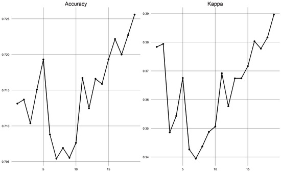 Table 1 particularizes these classifiers with model hyperparameters being fine-tuned by a grid search with a 5-fold cross-validation method to select the set of hyperparameters that achieve the best performance and avoid overfitting. In this study, a number of k as 10 was the optimal for the KNN model. In the SVM model with two parameters, the cost choice C and a kernel smoothing parameter σ of 1 were selected. The tuning parameters of the ANN model included the number of hidden layers optimized from 5 to 10, and weight decay was set to 0.1 and 0.5 for the training process to avoid overfitting. The mtry parameter was used as a tuning parameter for the RF model. For the GBM, an interaction depth of 1 and a number of trees of 50 were the best parameters; additionally, shrinkage, known as the learning rate, was considered to improve performance significantly.
