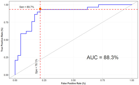 The detection breast cancer performance of the ML-DL combining model is observed in Table 5. It shows that adding a clinical-based model in addition to the mammogram-based model provided greater accuracy than only one single model, with the best accuracy reaching 84.5%. The ROC curve in Figure 5 proved that the model built with image and clinical features from the ML-DL model can improve overall performance.