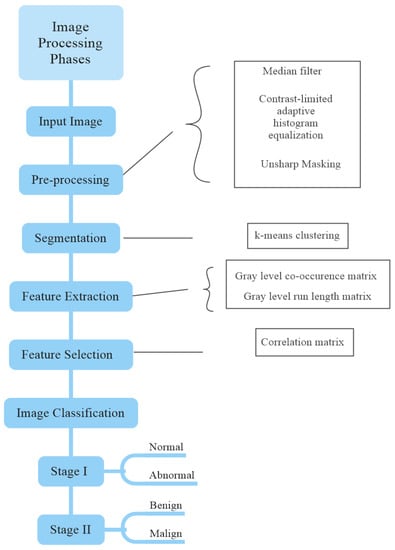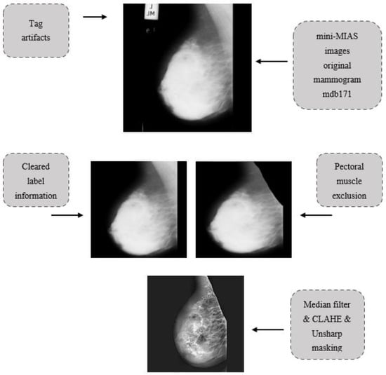 Before applying any image processing algorithms, pre-processing algorithms are of great importance to improve the results obtained [5]. In the literature, various pre-processing algorithms have been proposed to overcome the problem of misdiagnosis in mammography images [5,6,7,8,9,10]. These algorithms include several methods such as image resizing, mean filter, median filter, Gaussian filter, wiener filter, un-sharp masking, histogram equalization, anisotropic diffusion, and contrast-limited adaptive histogram equalization (CLAHE). In these studies, it was emphasized that different pre-processing algorithms affect classification performances [6,7,8].