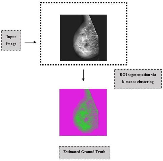 The next important step for mammography images that are cleared of labels by pre-processing methods is to extract ROIs by clearing the pectoral muscle from the images with the appropriate segmentation method [21,22]. In image processing, it is important to emphasize the ROI because these regions are the part of an image that we want to filter or somehow manipulate. Color, shape, texture, contrast, etc., are obtained from these regions. Computer-aided systems can be used in diagnosis by classifying according to features. The details of the k-means clustering method, which is preferred as a segmentation method in the literature and which we used in this study, are explained below. This method has been preferred because it does not require any prior knowledge and is better than other region enlargement techniques.