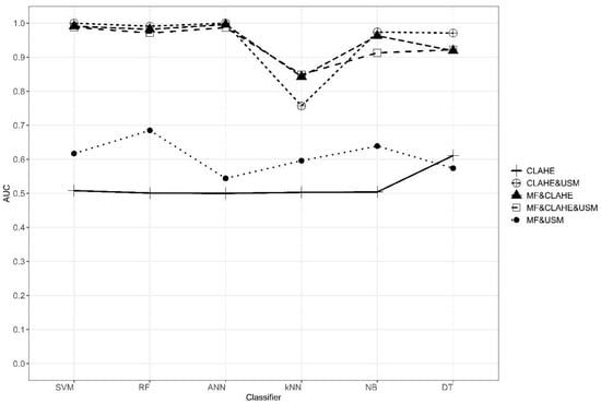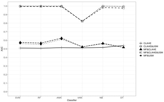 The results of the normal/abnormal classification of the characteristics of the analyzed data set are given in Table 2. When the CLAHE algorithm is used as a stand-alone pre-processing method, the effect on the performance of the classification methods was found to be lower. When the median filter is used together with the CLAHE algorithm, the classification performances increased. When the MF&CLAHE combination is used, AUC values are higher than the MF&USM combination, excluding the k-NN classification method. With the combination of CLAHE&USM, higher classification performances were obtained compared to single and other double combinations. In the combination of MF&CLAHE&USM, when all three different pre-processing methods are used together, the classification performances obtained are very close to the CLAHE&USM combination. According to the results in Table 2, when we look at measures such as overall accuracy, sensitivity, AUC, F-measure, the performances of SVM, RF, ANN, NB, and DT classification methods are more successful than the k-NN method. The graph showing the AUC values for five different pre-processing combinations and six different classification methods is presented in Figure 5.