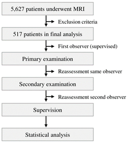 Flowchart about the experimental process of the presented study. After applying the described exclusion criteria, 517 MRIs were integrated into the final examination. Statistical analysis was performed after supervision process of examination.