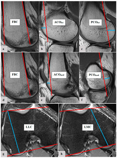 Exemplary depiction of the determination of the femoral bone cortex (FBC, (a,d)) and the measurement of lateral anterior femoral condylar offset (ACOlat, (b)), lateral posterior femoral condylar offset (PCOlat, (c)), medial anterior femoral condylar offset (ACOmed, (e)), medial posterior femoral condylar offset (PCOmed, (f)), length of lateral femoral condyle (LLC, (g)) and length of medial femoral condyle (LMC, (h)): The determination of FBC as well as measurements of ACOlat, PCOlat, ACOmed and PCOmed were all performed in sagittal view of the knee joint in MRIs. To measure the femoral condylar offset parameters, the anterior and posterior femoral shaft bone cortex were determined in the sagittal view (a,d). Using CentricityTM Universal Viewer (RA1000, edition 2019, Buckinghamshire, Great Britain), the positions of the anterior and posterior femoral shaft axes were projected in the image, which best represented the anterior/posterior femoral condyle. The distance between the cortical bone of the anterior femoral condyle and the anterior cortex axis defines the ACO (b,e). According to the same principles, the PCO was defined in the posterior compartment. The distance between posterior cortex axis and posterior cortical condylar bone was measured (c,f). ACO and PCO were measured in the medial and lateral knee joint compartments. LLC and LMC were measured in the axial view. To define LLC and LMC, a tangent was applied to both the anterior and posterior cortical borders of the femoral condyles. The widest distance between these was measured for the lateral (g) and medial condyles (h).