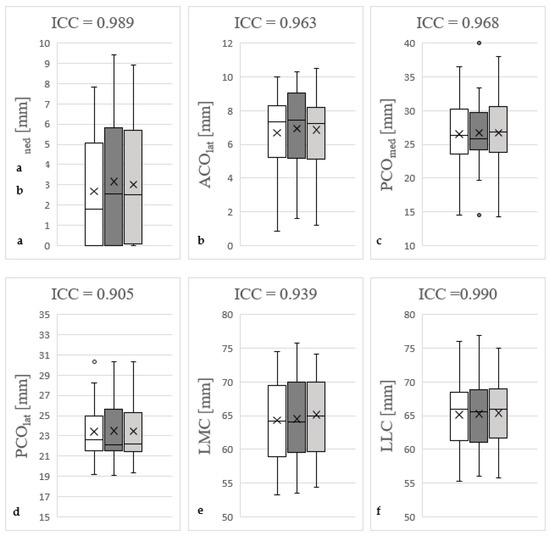Determination of intraclass/interclass correlation coefficient (ICC) of medial anterior femoral condylar offset (ACOmed), (a); lateral anterior femoral condylar offset (ACOlat), (b); medial posterior femoral condylar offset (PCOmed), (c); lateral posterior femoral condylar offset (PCOlat), (d); length of medial femoral condyle (LMC), (e); and length of lateral femoral condyle (LLC), (f). The white box plots represent the initial measurements by Y.H., the dark grey ones represent the second recordings by Y.H. The box plots marked in light grey reflect the measurements by M.-P.M. The figures show the cumulative ICC between the initial and control measurements by Y.H. and the observations by M.-P.M. Outliers are marked with points. Excellent measurement reliability (ICC > 0.9) was determined for all measured parameters. The control measurements were carried out at intervals of two weeks by the same investigator as well as another one in blinded fashion based on 50 subjects.