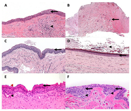 Figure 1. A representative histological photomics of developmental OCs. (A) DC is lined by uniformly thin nonkeratinized squamous cell epithelium (arrow) with fibrovascular wall and scattered inflammatory cells (arrowhead). EC show similar histological features to DC; however, located in the lamina propria (B) Hyperplastic dental follicle consists of delicate fibrocollegenous stroma with scattered odontogenic epithelial islands (arrow). (C) OKC is lined by uniformly thin parakeratinzed squamous cell epithelium with surface corrugation and hyperchromatic basal cell layer (arrow). (D) OOC is lined by uniformly thin orthokeratinized stratified squamous epithelium (arrow) with keratin debris within the cyst lumen (arrowhead). (E) GOC is lined by uniformly thin nonkeratinized squamous epithelium with abluminal eosinophilic cuboidal (hobnail) cells (arrow) with ducts (black arrowhead) and cilia (red arrowhead) observed in the cyst lining. (F) LPC is lined by uniformly thin nonkeratinized squamous epithelium-exhibiting clear cells (arrowhead) and epithelial plaques (arrow).