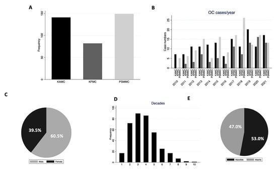 Figure 2. (A) OC distribution at each center. (B) Distribution of OCs at each center per year. PSMCC had the highest frequency in 2018. (C) Gender distribution of OCs. (D) Age distribution of OCs (E) Location distribution of OCs.