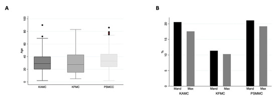 Figure 3. (A) The mean age of OCs at each center is relatively similar, with a p-value of 0.1. (B) Location distribution of OCs at each center.