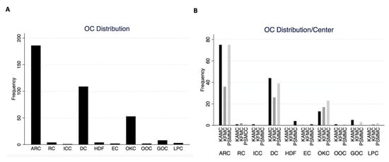 Figure 4. (A) Overall OC frequency in the current cohort. (B) OC frequency in each center.