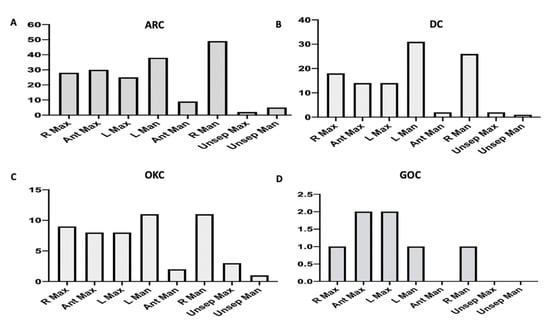 Figure 5. Distribution of OCs according to the specific location. (A) ARC, (B) DC, (C) OKC, (D) GOC. (Abbreviations: R Max, right maxilla; Ant Max, anterior maxilla; L Max, left maxilla; L Man, left mandible; Ant Man, Anterior mandible; R Man, right mandible; Unsep Max, unspecified location in maxilla; Unsep Man, unspecified location in mandible.