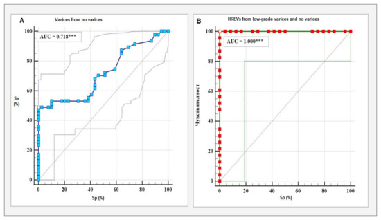 ROC curves of diagnostic accuracy of 2D-SWE; (A) Differentiation of patients with EVs from those with no varices, (B) Differentiation of grade 4 varices from no varices and EVs grades 1, 2, and 3. Se—sensititity; Sp—specificity; ***—Statistical significance at p ≤ 0.001.