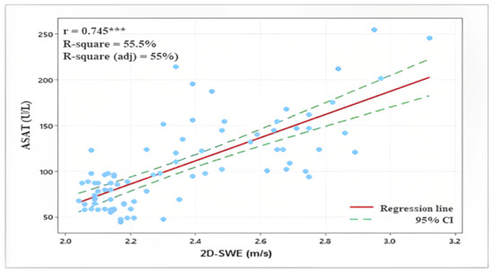 Correlation between liver 2D-SWE and biochemical blood indicators ASAT, ALAT, and alkaline phosphatase. ***—Significant assossiation (p < 0.001); r—Pearson’s correlation coefficient; R-suqare—coefficient of determination.