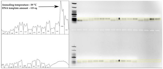 The optimization of the MSP reaction mixture for semi-quantitative evaluation of the MGMT promoter methylation status was performed considering previously recommended reaction conditions [13,27,28]. Firstly, sets of MSP reactions were designed to choose the adequate MGMT primers annealing temperature and the amount of template DNA. MSP (PCR) products were analyzed by agarose gel electrophoresis, and the relative DNA yield/quality was calculated by the ImageJ software. After such optimization, the annealing temperature of 59 °C and the amount of bisulfite-converted DNA of 125 ng were chosen (Figure 1 and Figure 2).