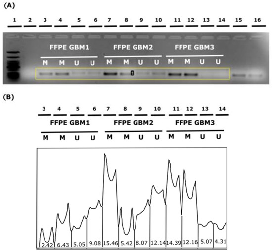 An example of ImageJ software analysis performed after the MSP amplification of MGMT promoter in FFPE glioblastoma (GBM) samples. (A) Agarose gel image prepared for the ImageJ analysis (the yellow box represents the ImageJ analysis area): 1—DNA marker (Low Molecular Weight DNA ladder, New England BioLabs, Ipswich, USA); 2—NTC—non-template control (primer set for methylated MGMT); 3–14—Methylated MGMT promoter MSP products (M) alongside corresponding Unmethylated MGMT promoter MSP products (U) of three GBM samples. (B) Histogram chart representing relative fluorescence intensity of individual bands of MSP products on the gel.