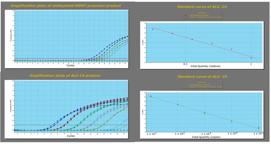 The PCR efficiency (E) was determined for the methylated MGMT promoter and ALU C4 amplification. qMSP reactions were conducted with serial dilutions (factor-2× for the MGMT promoter product and factor-10× for the ALU C4 product), a standard curve was generated, and its slope (which defines the E value) was calculated in Aria MxPro—Mx3005P software.