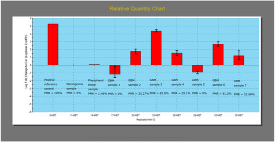 After the optimization reactions, the mass qMSP evaluation was conducted. PMR values were calculated for each glioma sample (N = 34) and appropriate positive and negative controls (reference positive control, meningioma, peripheral blood) (Figure 7).