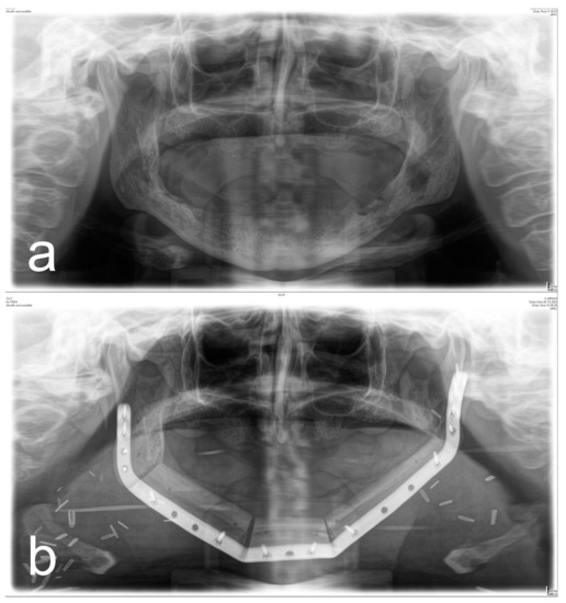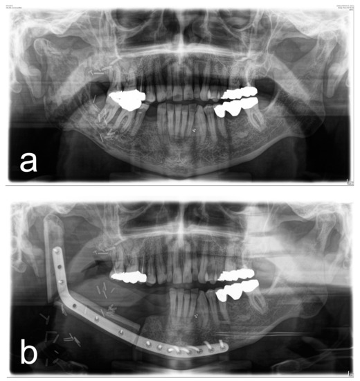 (a) Panoramic X-ray of a patient with extensive ORN of the mandible. (b) Postoperative panoramic X-ray of the same patient after ablative and reconstructive surgical therapy of ORN using a vascularized 3-segment fibula flap with an extraoral soft tissue transfer and a patient-specific implant.